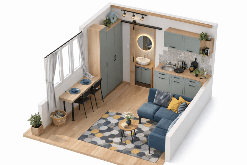 Die durchdachte Raumaufteilung sorgt für klare Zonen, ausreichend Stauraum und ein angenehmes Raumgefühl – auch auf kleiner Fläche.