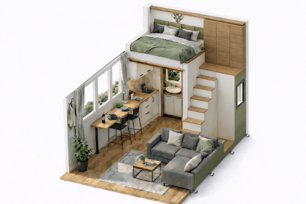 Das Tiny House 22 überzeugt durch eine intelligente Raumaufteilung, die jeden Quadratmeter optimal nutzt. Dank vertikaler Planung mit Schlafgalerie entsteht ein überraschend großzügiges Wohngefühl – ideal für dauerhaftes Wohnen, Urlaub oder Vermietung in Österreich.